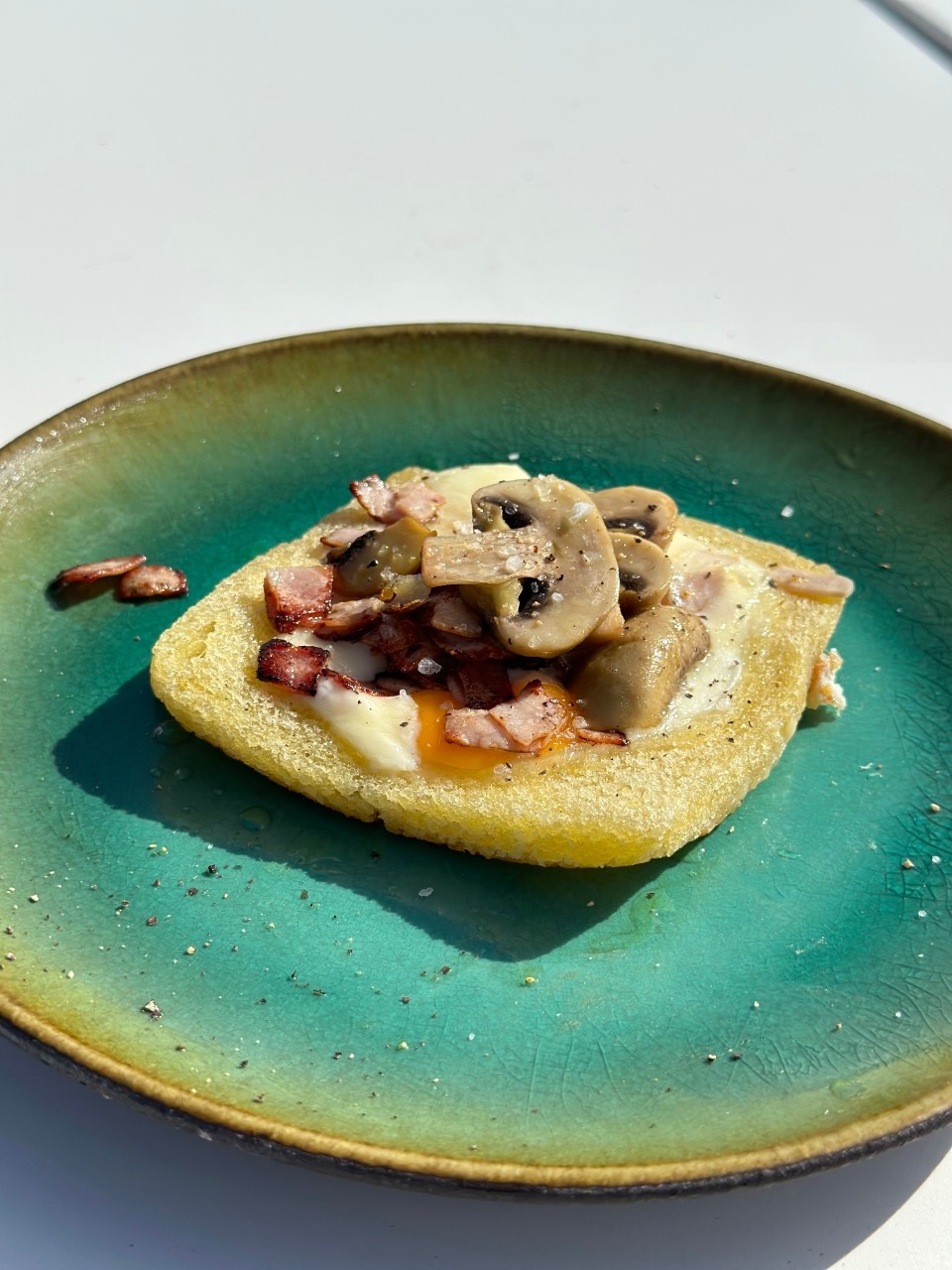 Comece com o pão, depois a carne, fiambre, queijo e alheira. Repita mais uma vez. Por fim, tape com mais uma fatia de pão. Regue com o molho da francesinha preparado, coloque o queijo manchego aos cubos por cima e o presunto crocante.